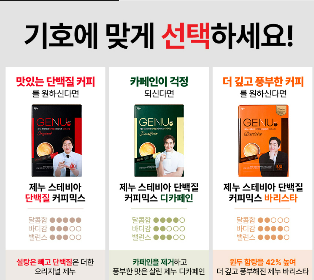 하루 간편하게 마시는 커피로 단백질을 ‘가볍게 보충’하는 데에는 아주 적당한 제품입니다.제누 3가지 종류,기호에 맞게 선택하세요!