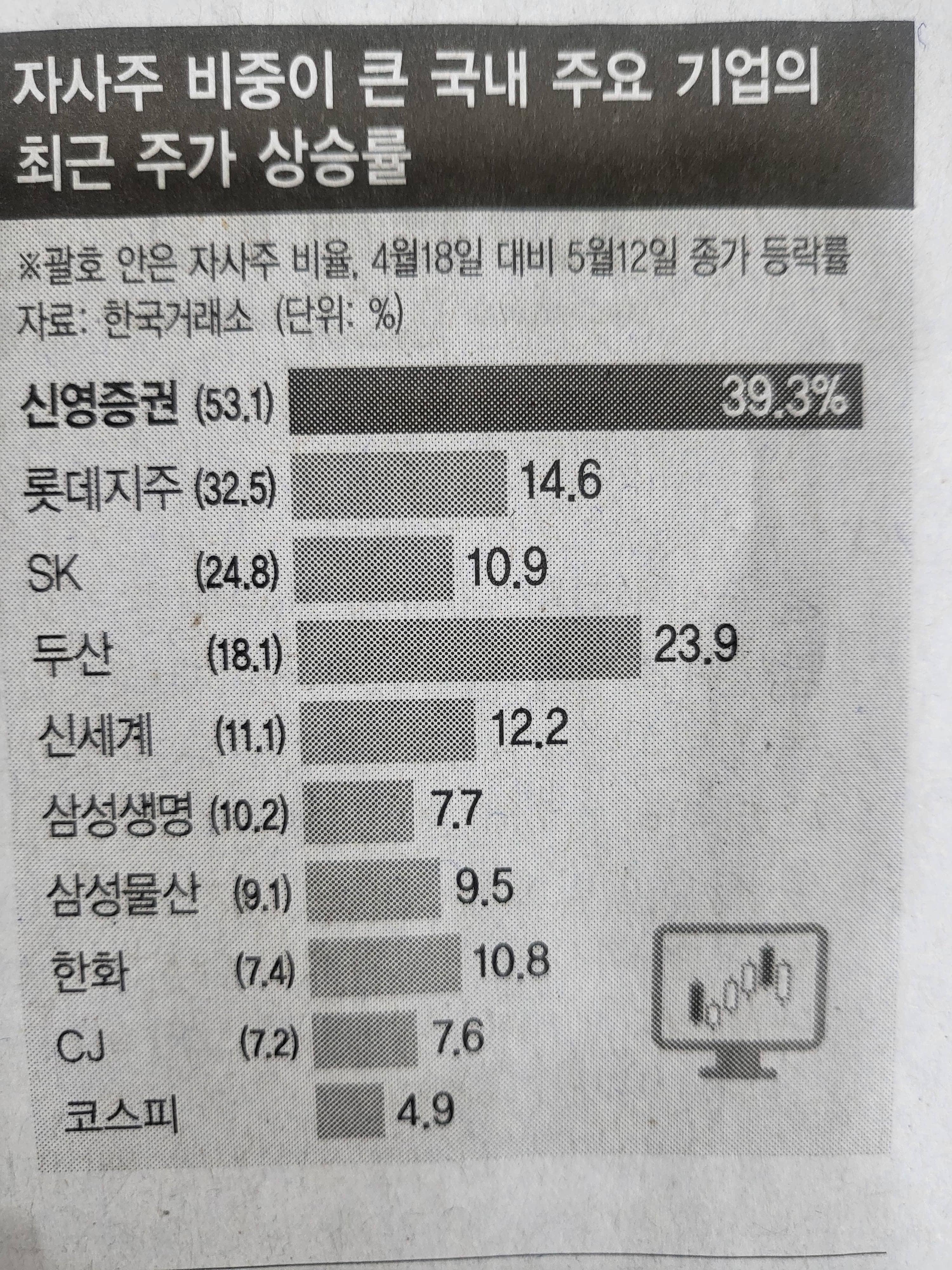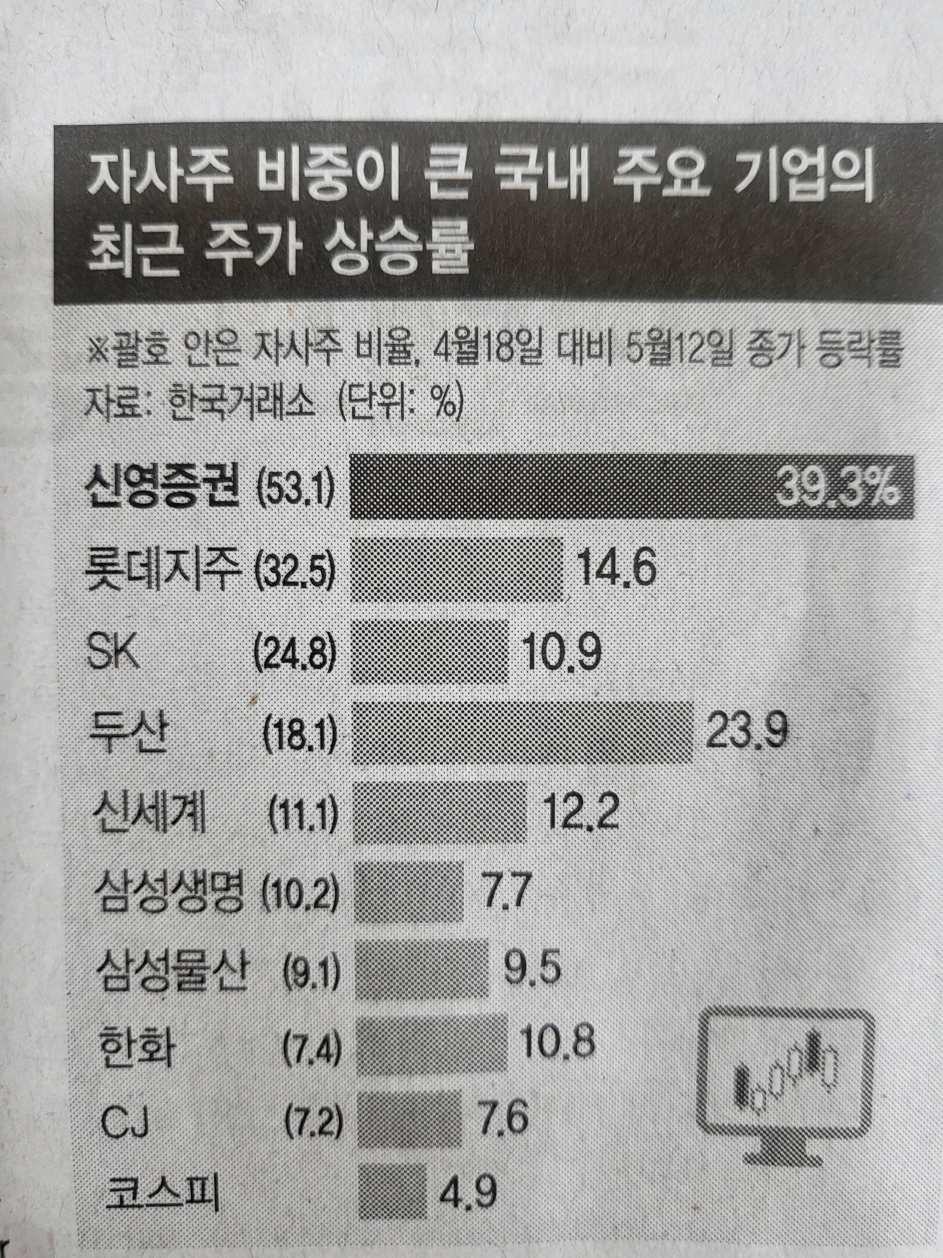 그 외에도 SK, 삼성물산, 삼성생명, CJ 등 자사주 비율이 높은 기업들이 대체로 상승세를 보였습니다.