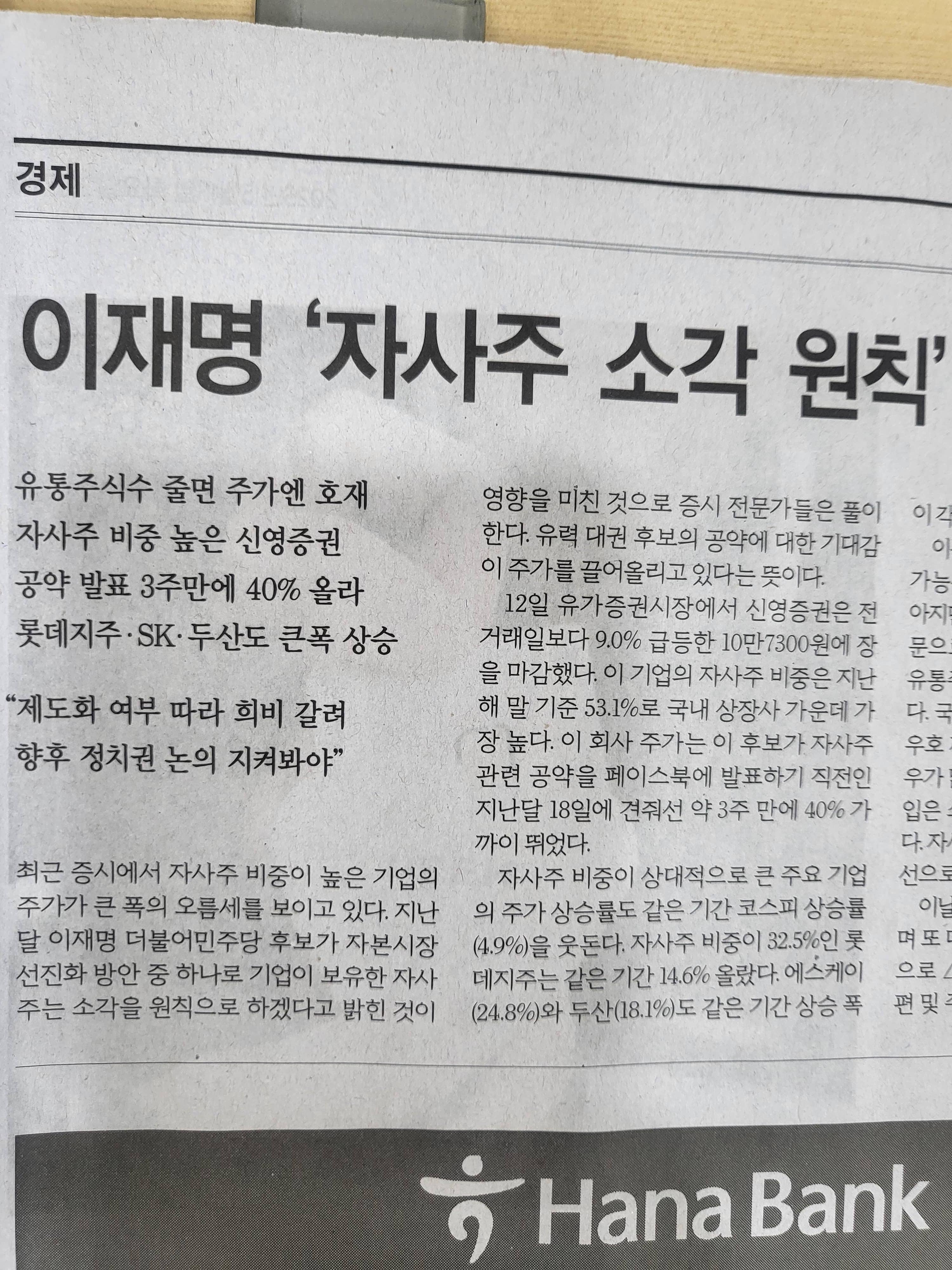 이걸 소각한다는 건 주식 수를 줄여 주주가치를 높이겠다는 의미예요.이재명 대표가 “자사주는 소각을 원칙으로 하겠다”고 밝히면서,