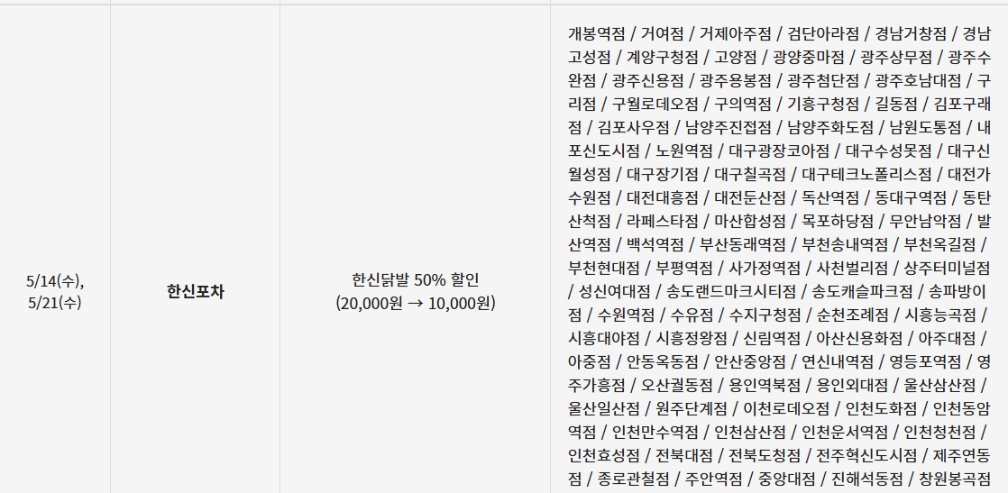 • 한신닭발 50% 할인 (2만 원 → 1만 원)