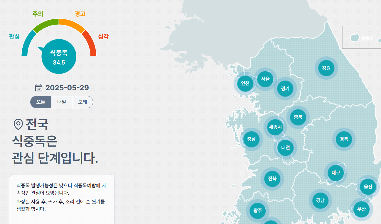 기상청에서 실시간으로 제공하는 지역별 식중독 위험도를 바로 볼 수 있어요.