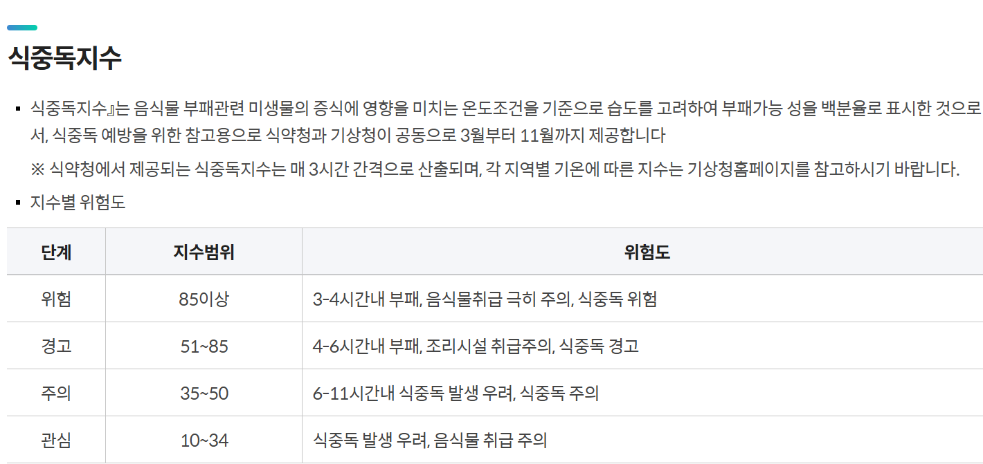 날씨와 환경 조건에 따라 식중독균이 얼마나 잘 자랄 수 있는지를 수치로 보여주는 지표예요.기상청은 매일매일의 기온, 습도, 강수량 등을 분석해