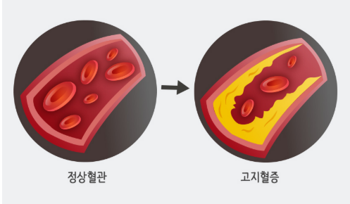 고지혈증은 혈액 내에 지방 성분(콜레스테롤, 중성지방 등)이 과다하게 쌓여 혈관 벽에 염증을 일으키는 질환이에요.