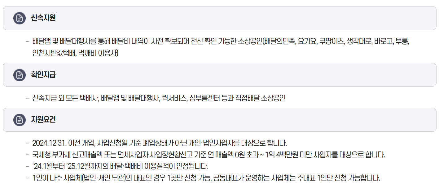 - 신속지급은 배달플랫폼사에서 제공한 2024년 배달비 실적을 기준으로, 증빙자료 제출 없이 빠르게 지원금이 지급되는 방식입니다.