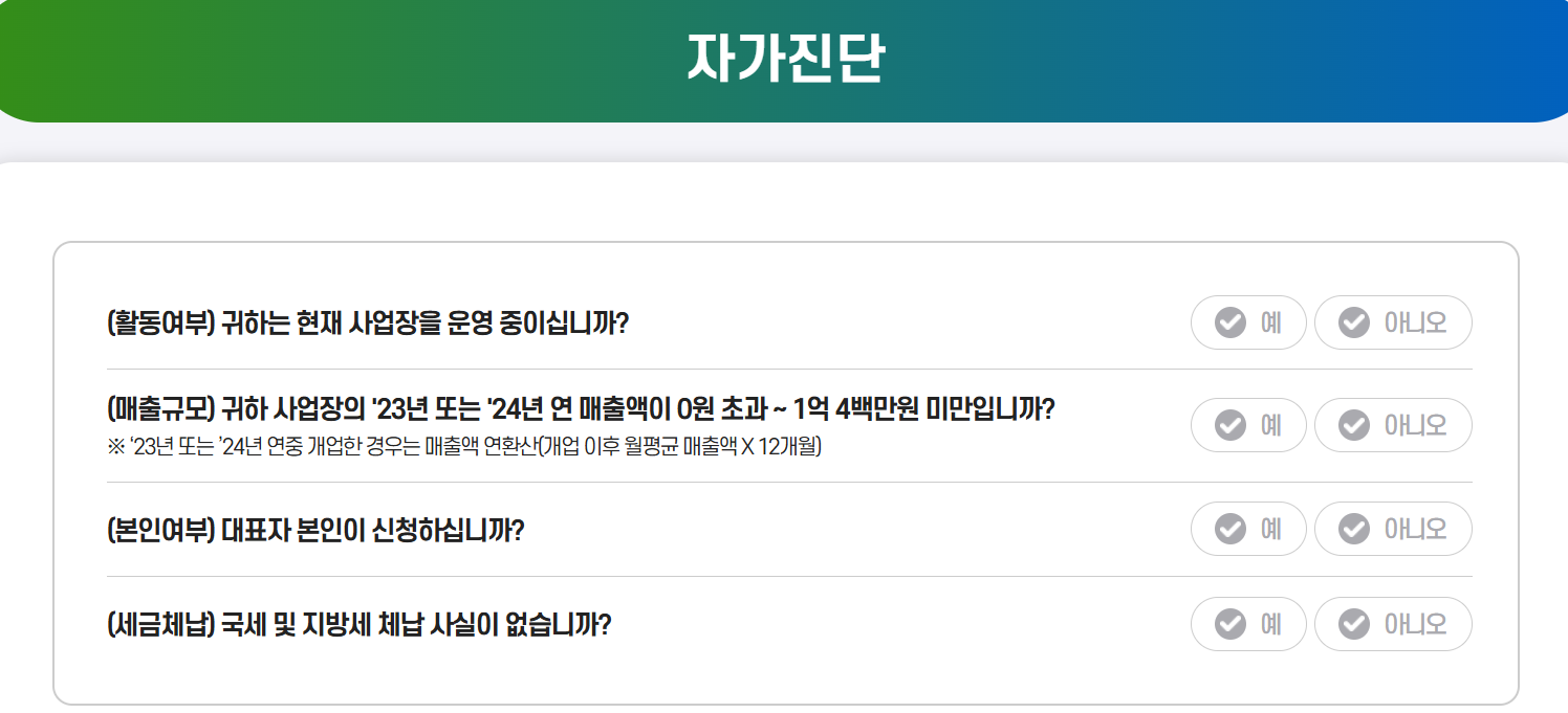 - 한 명의 사업자는 1개 사업체만 신청이 가능합니다. 여러 개의 사업체를 운영하는 경우에도 1개 사업체만 지원받을 수 있습니다.