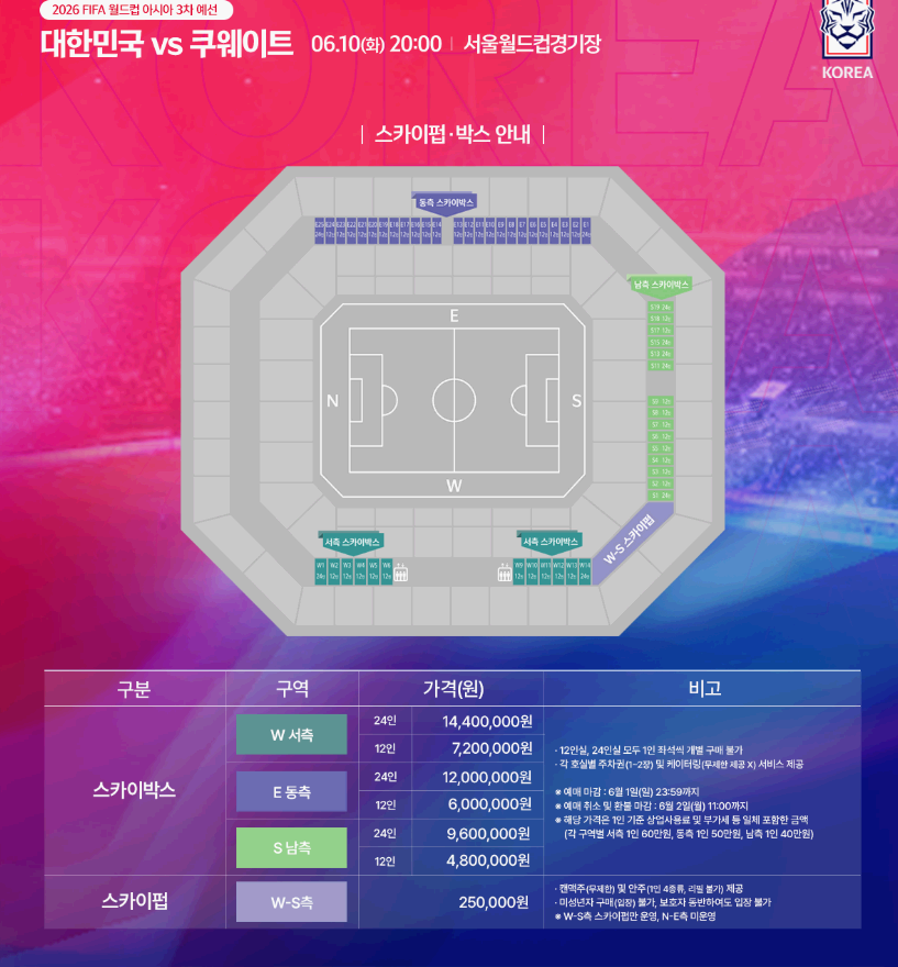 W 서측 스카이박스: 24인실 14,400,000원 / 12인실 7,200,000원