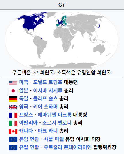 G7 정상회의는 프랑스, 미국, 영국, 독일, 일본, 이탈리아, 캐나다로 이루어진, 소위 세계 7대 선진국 모임이에요.