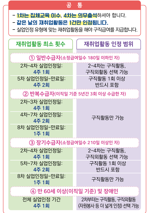 최소 4주마다 구직활동 증빙 후 실업인정 신청( 1차, 4차는 고용센터 방문 필수/ 2,3차는 온라인 실업인정 신청 가능)