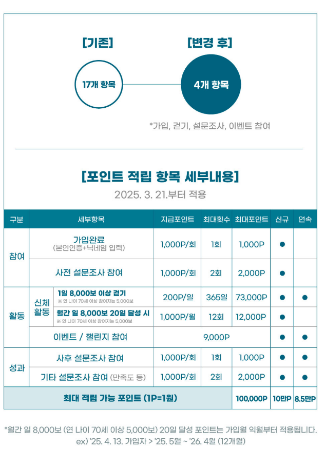 • 하루 8,000보 걷기 목표 달성 시 최대 10,000포인트 적립 가능.