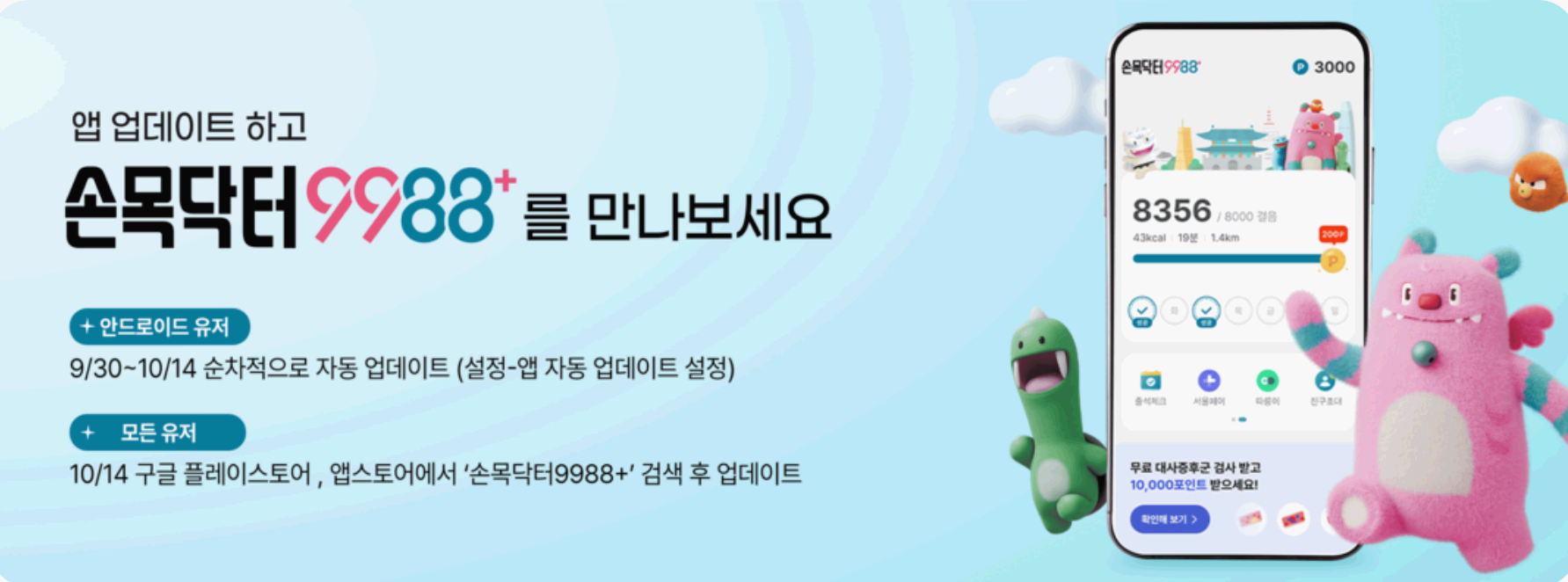 손목닥터9988+가 새롭게 업데이트됩니다! 이 앱은 서울시민 누구나 쉽게 자신의 건강을 관리하고, 더 나아가 건강한 습관을 형성할 수 있도록 돕는 건강증진 지원 서비스입니다. 이번 업데이트