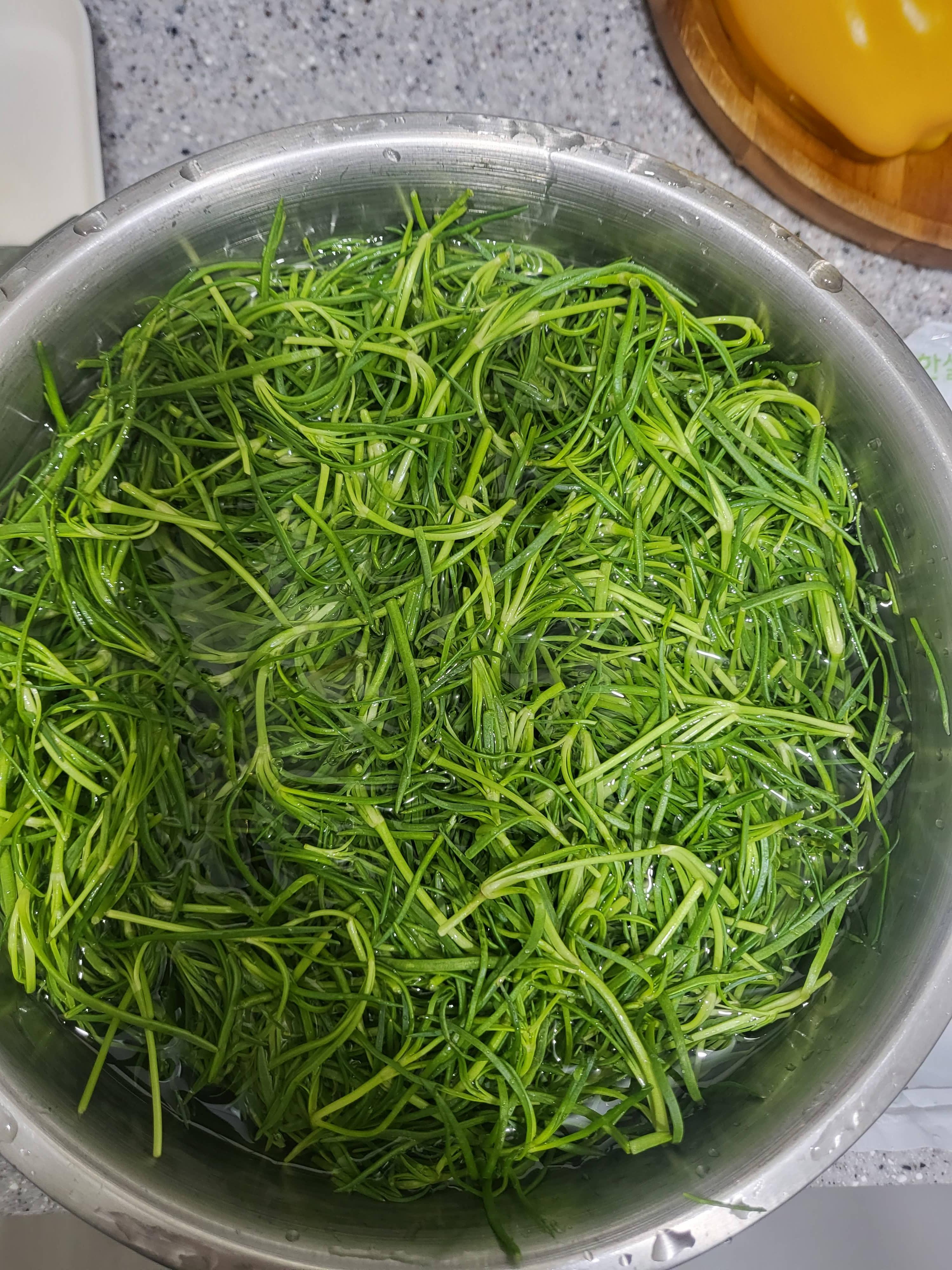1. 세발나물을 흐르는 물에 깨끗이 씻고 물기를 털어주세요.