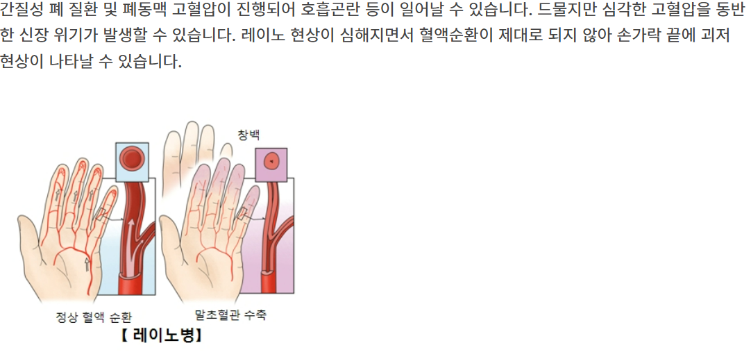 📌 레이노 현상은 경피증의 초기 단서로 흔하게 나타나니 꼭 기억해두세요!