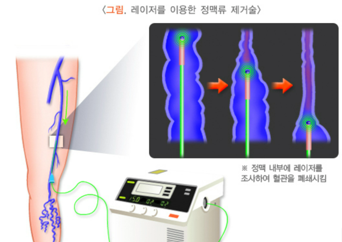 요즘 많이 활용되는 최신 치료법이에요. 혈관에 특수 장비를 삽입하고 열을 가해 정맥을 폐쇄하는 방식으로, 흉터가 거의 없고 회복이 빨라 인기가 높습니다.