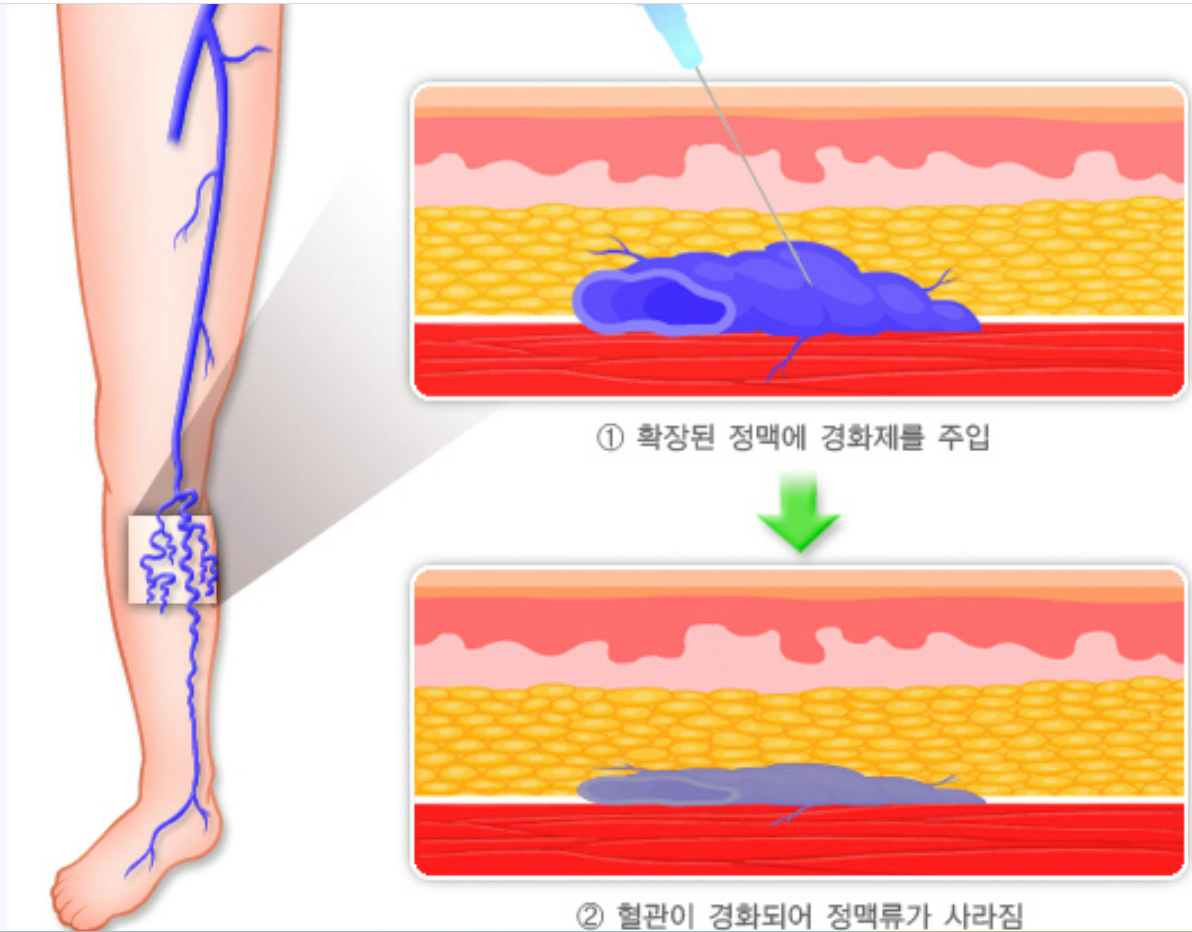 작거나 중간 크기의 정맥류에 효과적인 치료예요. 경화제를 정맥에 주사해 혈관을 막아버리는 방식인데요, 마취나 입원 없이 외래에서 진행할 수 있어 간편합니다. 몇 주에서 몇 달 사이에 정맥이 흐려지고 사라지는 효과를 볼 수 있어요.