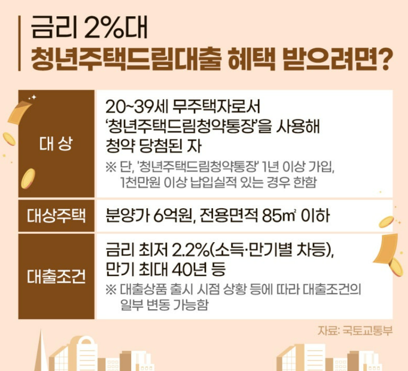 내 집 마련의 꿈을 더 이상 남의 일로 느끼지 않게 해주는 정책이에요.• 저금리(2%대)